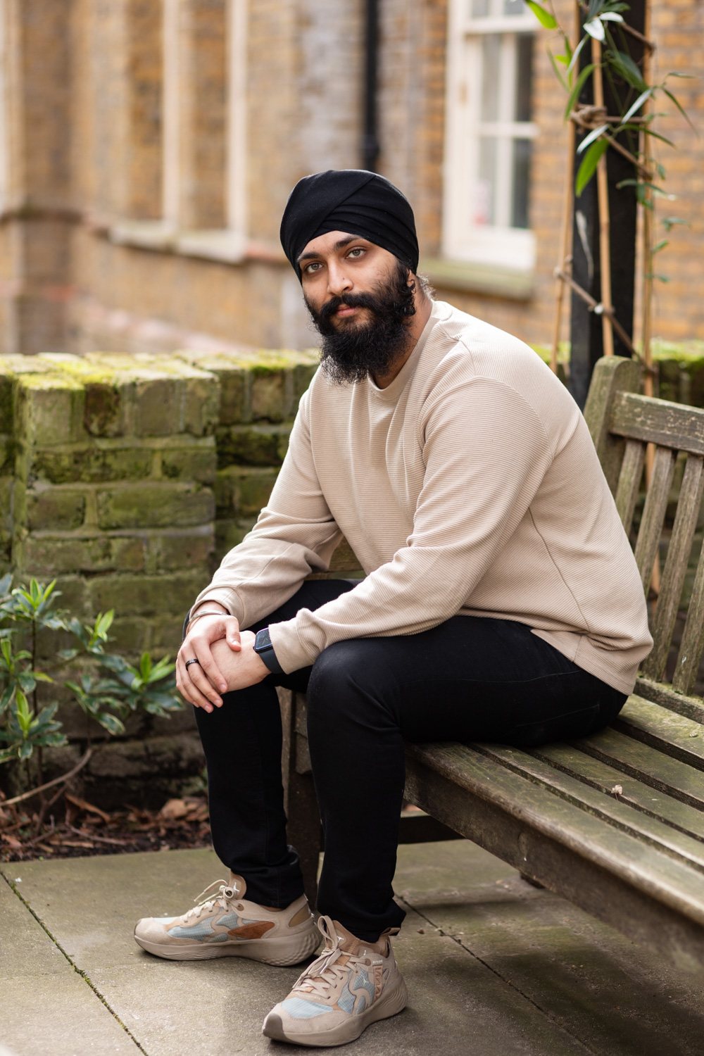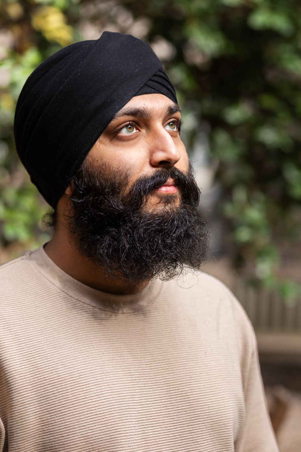 Jasneet Singh, photographed by Jayne Lloyd at University College London for The Leathersellers' Foundation. Photograph of a man with a beard wearing a black turban and beige sweatshirt, looking to the right side of the frame. He is positioned to the left and behind him a sandy-coloured building and bits of folliage are out of focus.