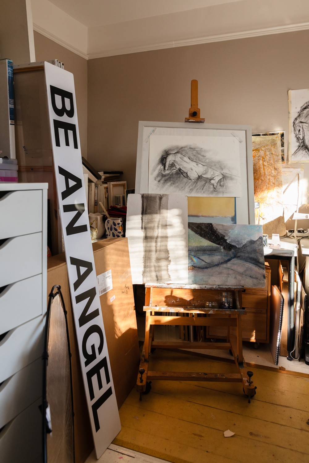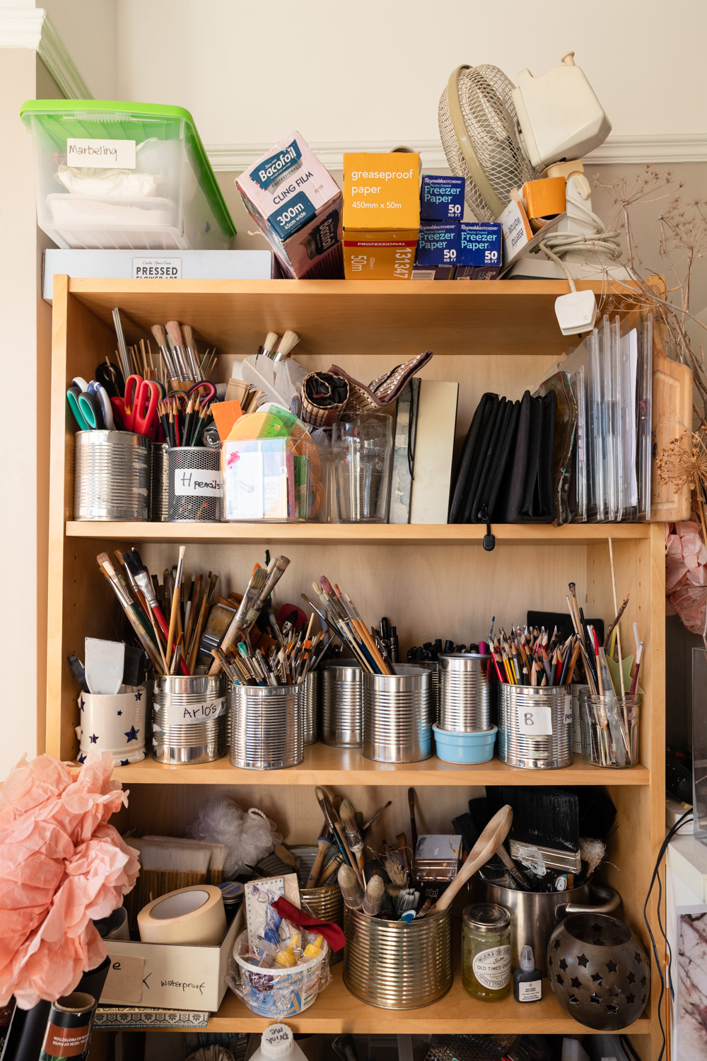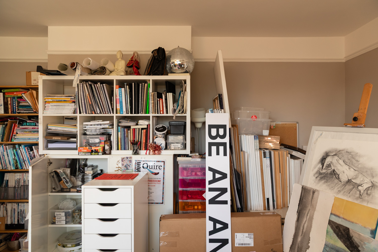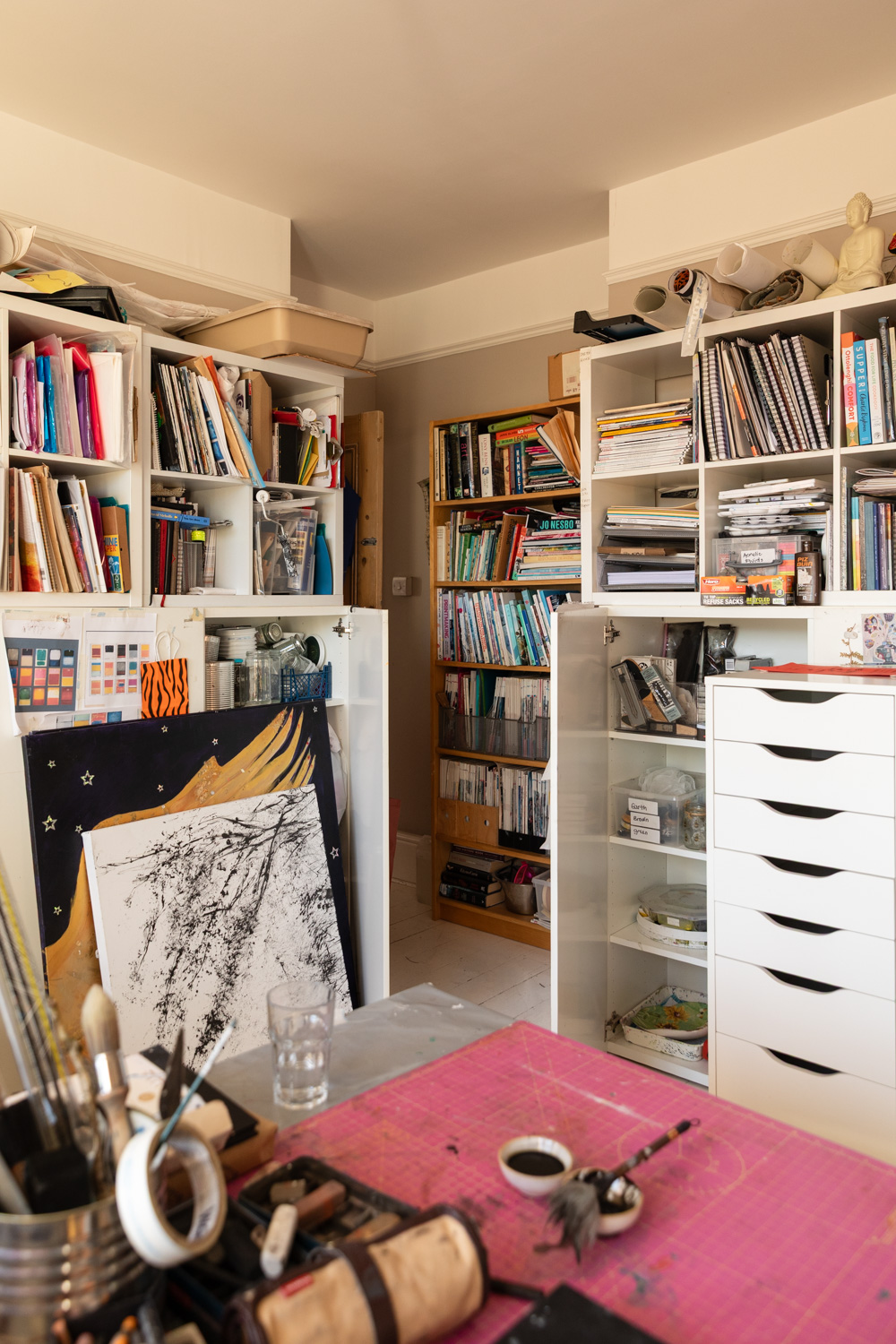 What made you decide to work from home rather than in premises offsite? We’ve got a large house, five bedrooms. This room wasn’t spare, by any means, because I had to shift our bed out. We’re in the back now, which is quieter anyway. Peter thought it would be a good idea that I could have this room, so we went for it. Now, I have filled it, and it’s too full, so, I wouldn’t mind a place where I could go, a studio, that I could just be surrounded with a things that I wanted to work with, rather than all of this stuff around me. I don’t need the frames or books in the same room. I would like to have them stored somewhere nearby, in the garden or something, so that I could just work on painting and focus, because it’s quite distracting, I think, with all of the stuff around me.  I want a space where I can be quiet. Or loud.